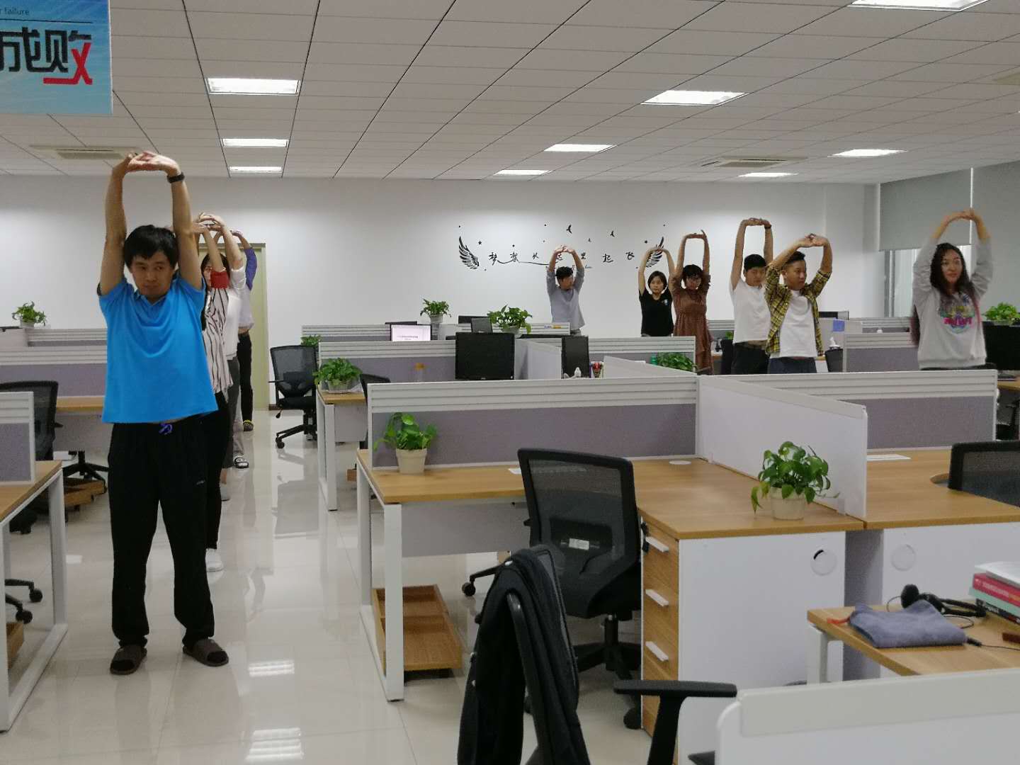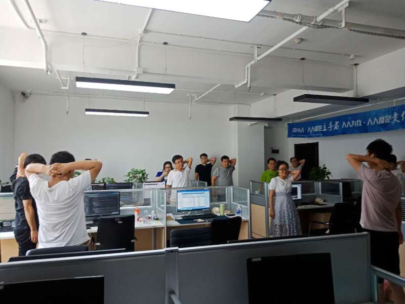 下午3點(diǎn)整,是聚進(jìn)科技沈陽(yáng)、鞍山、遼陽(yáng)、西安四個(gè)地方的團(tuán)隊(duì)集體運(yùn)動(dòng)時(shí)間。兩點(diǎn)半,各地公司內(nèi)秩序井然。三點(diǎn)整,音樂(lè)準(zhǔn)時(shí)響起,全體員工離開(kāi)座位跟隨著各地的運(yùn)動(dòng)大使活動(dòng)起來(lái)。